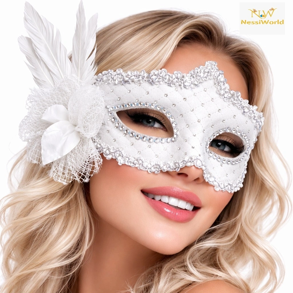 Beyaz Tüylü Venedik Lüks Balo Maskesi