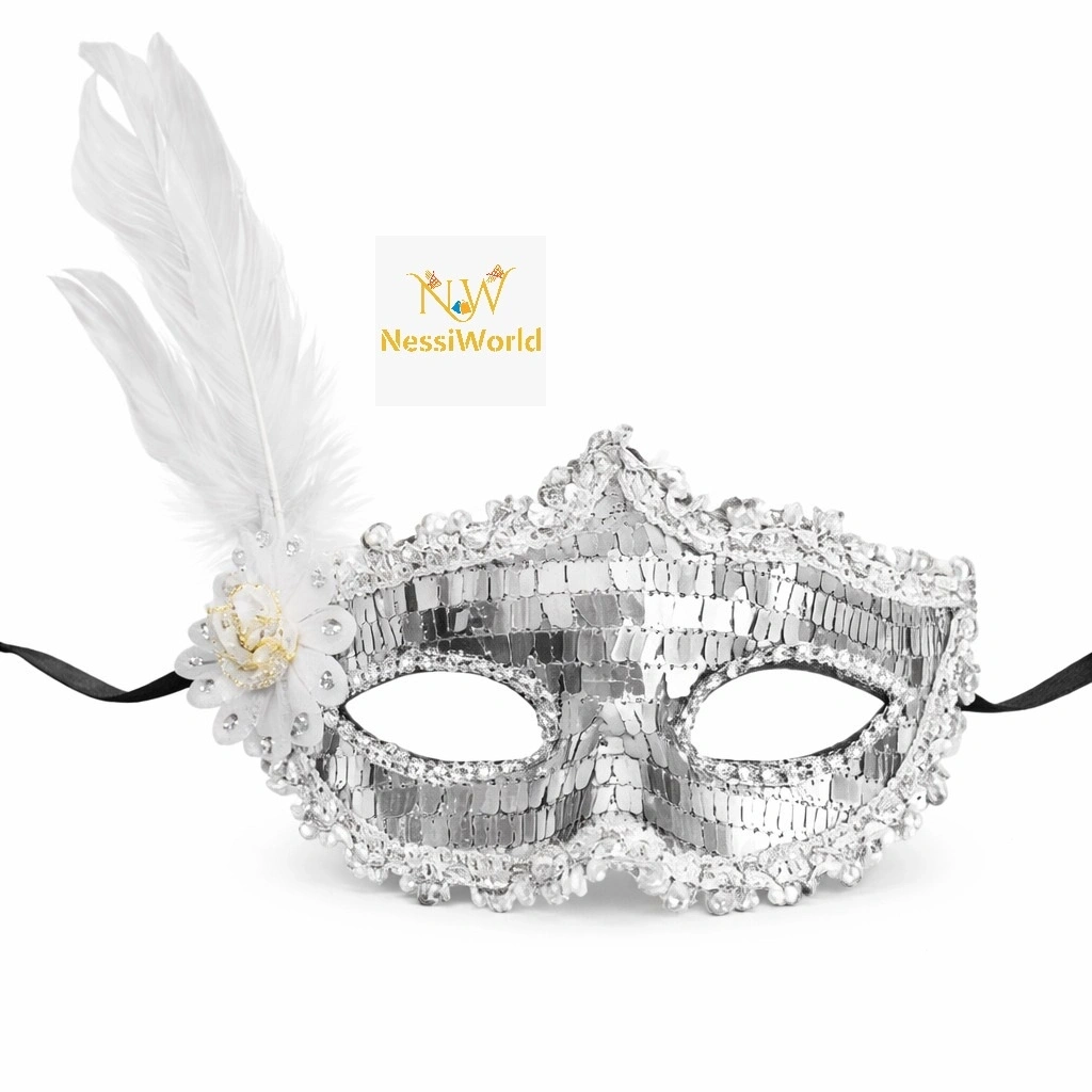 Gümüş Tüylü Payetli Lüks Taşlı Parti Maskesi