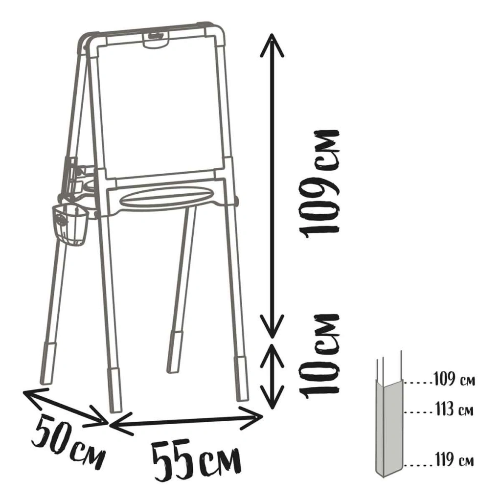 Ahşap tahtada kalemler için iki tepsinin yanı sıra, yan tarafa kolayca takılabilen ve manyetik harf ve sayıları